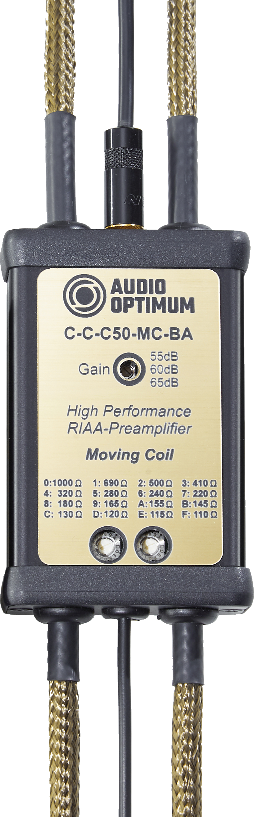 Für Plattenspieler mit nach außen geführtem Anschlusskabel ist auch der C-C-C50-MC-BA alternativ mit Cinch-Eingangsbuchsen und kürzeren Ausgangskabeln erhältlich.