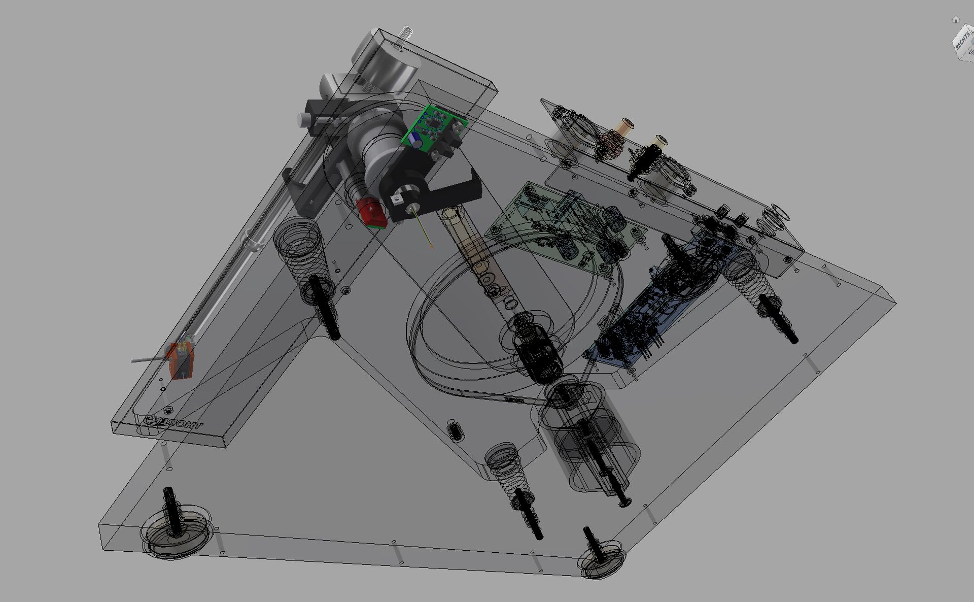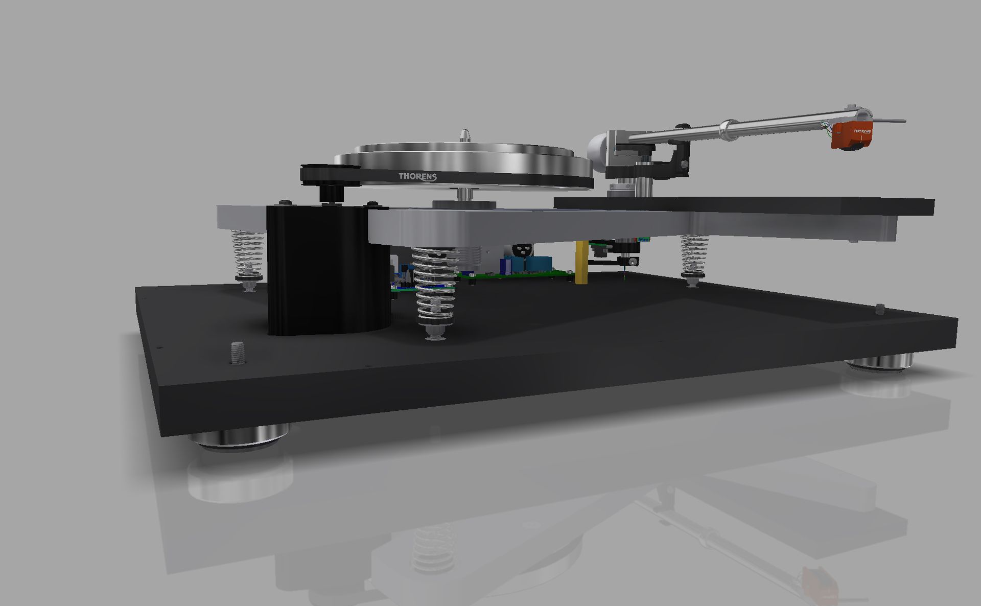 Die drei Federn des Subchassis hängen nicht am Top Board, sondern stehen auf dem Boden. Gleichzeitig verhindert ein gespannter Stahlfaden in der Verlängerung der Achse Motorrolle – Tellerachse seitliches Taumeln und sichert so ein kolbenförmiges Schwingen des Subchassis selbst beim Anlauf, wenn die Motorkraft am stärksten ist und der Riemen seitlich an der Tellerachse zieht.